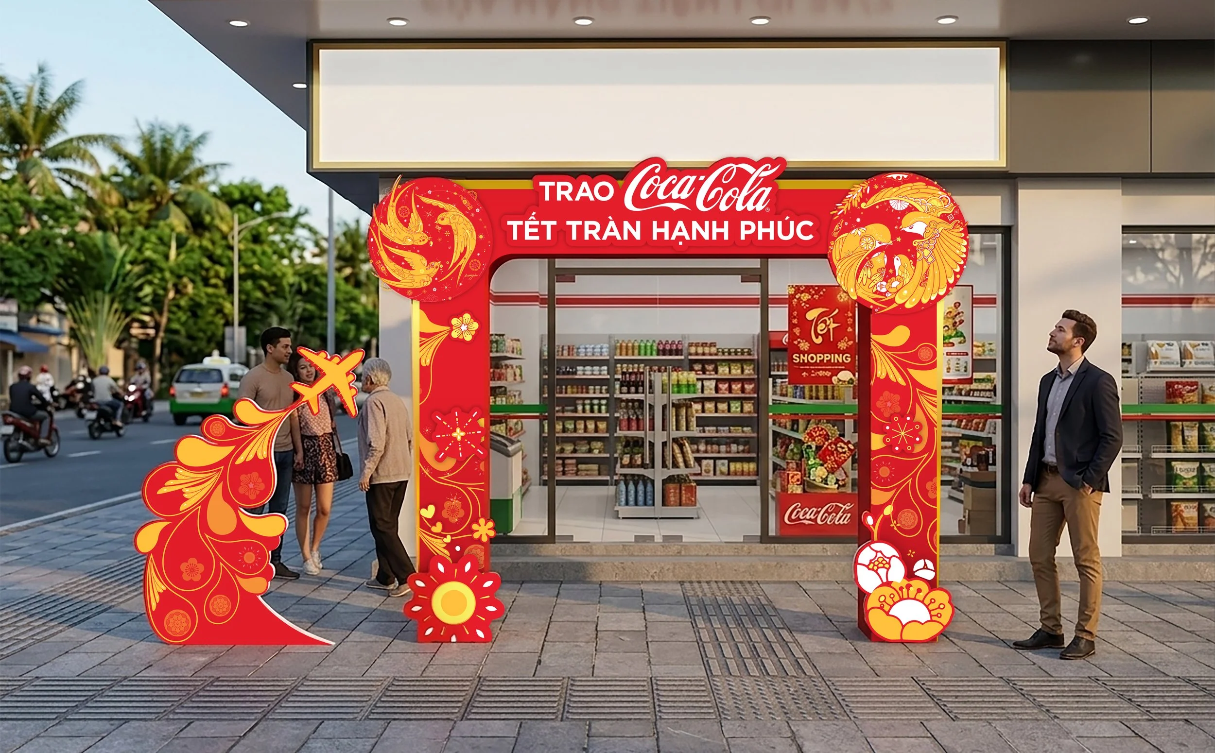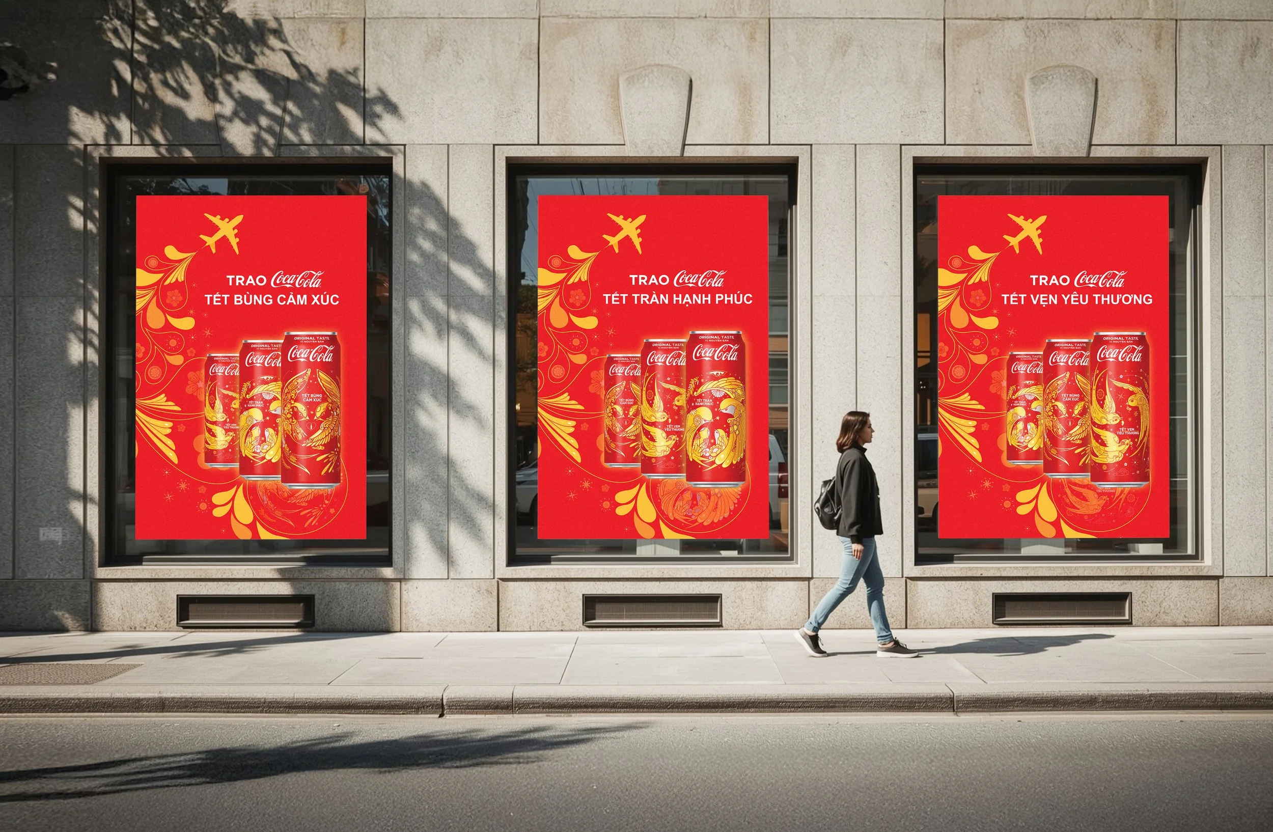 The concept explored the idea of an illustrated airplane traveling across Vietnam, symbolizing the journey of the new Coca-Cola cans as they “fly" from city to city to celebrate Lunar New Year with people everywhere. The airplane illustration carried the festive energy of the holiday and still connected to the marks in terms of style and design language. By integrating Coca-Cola brand colors and traditional Lunar New Year colors, playful illustration styles, and the idea of movement, the campaign communicated a message of reunion and celebration