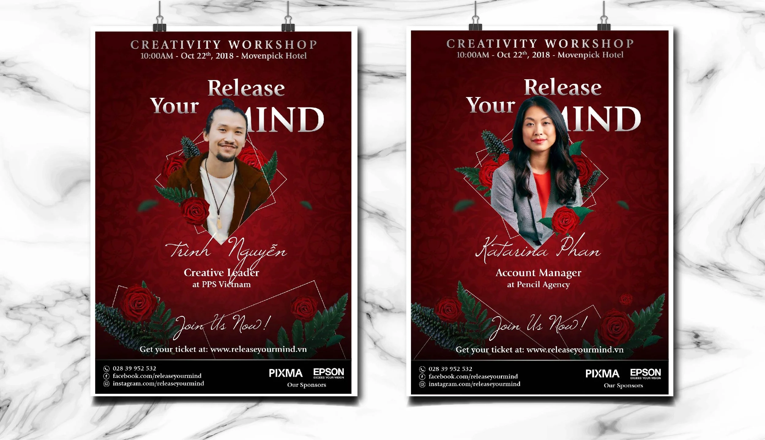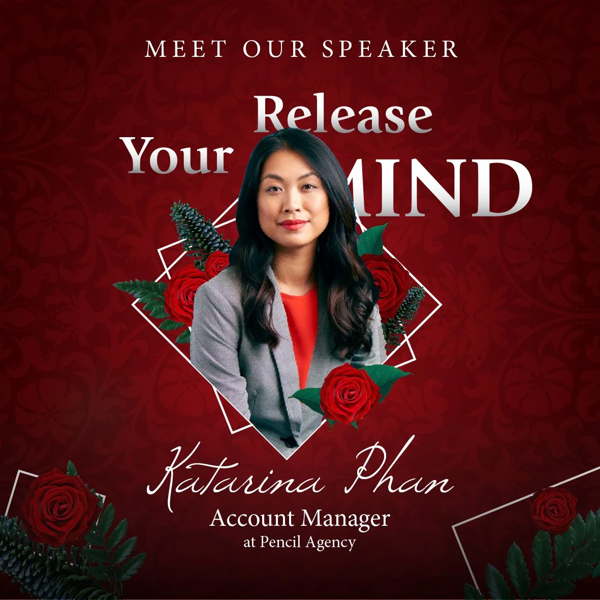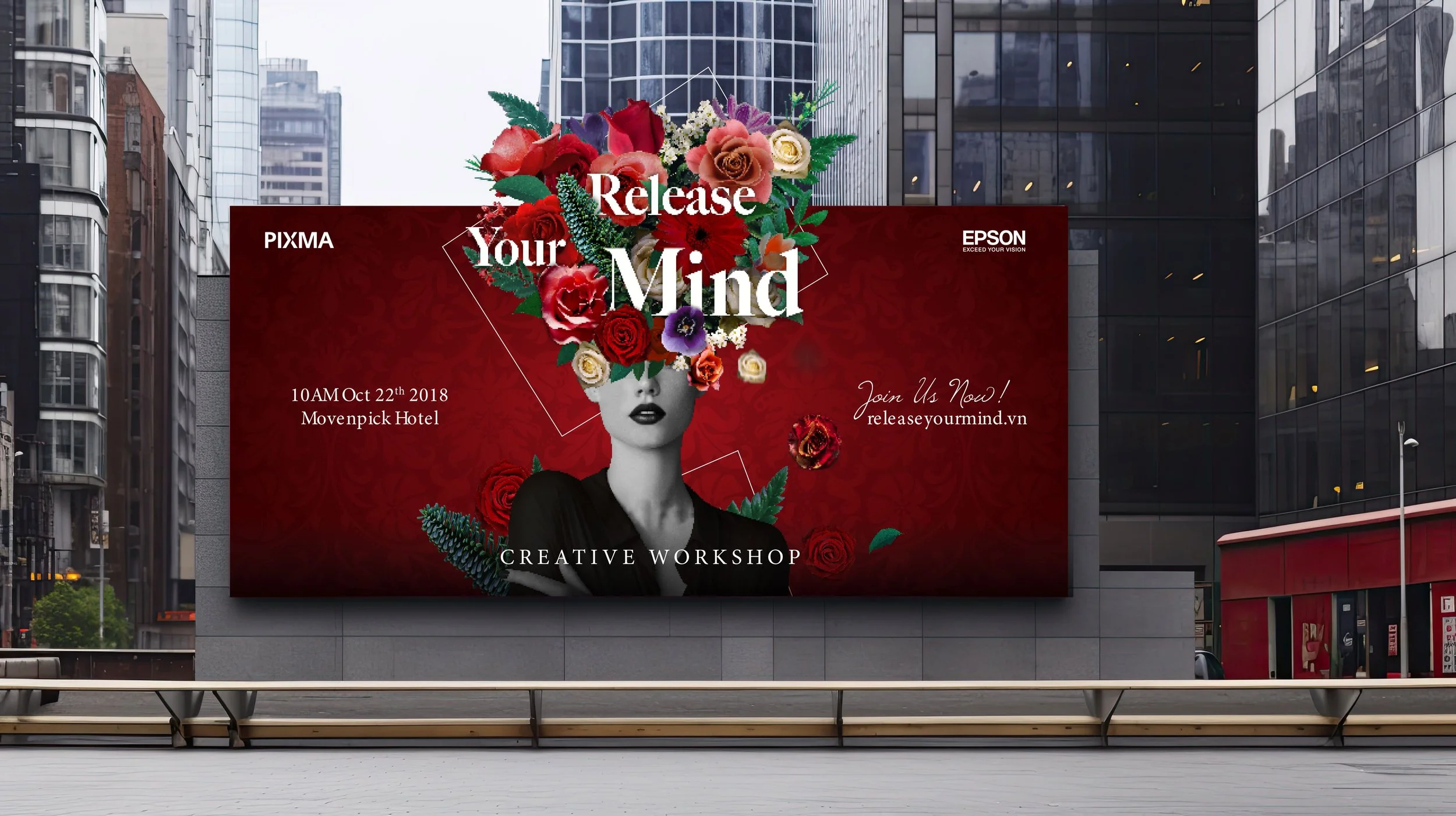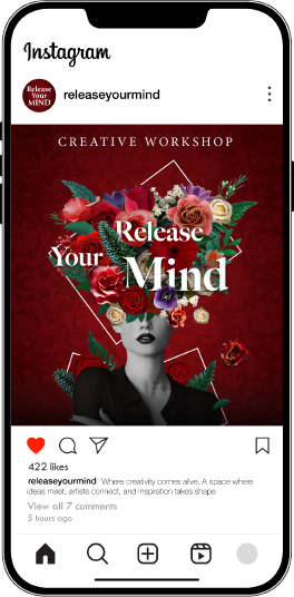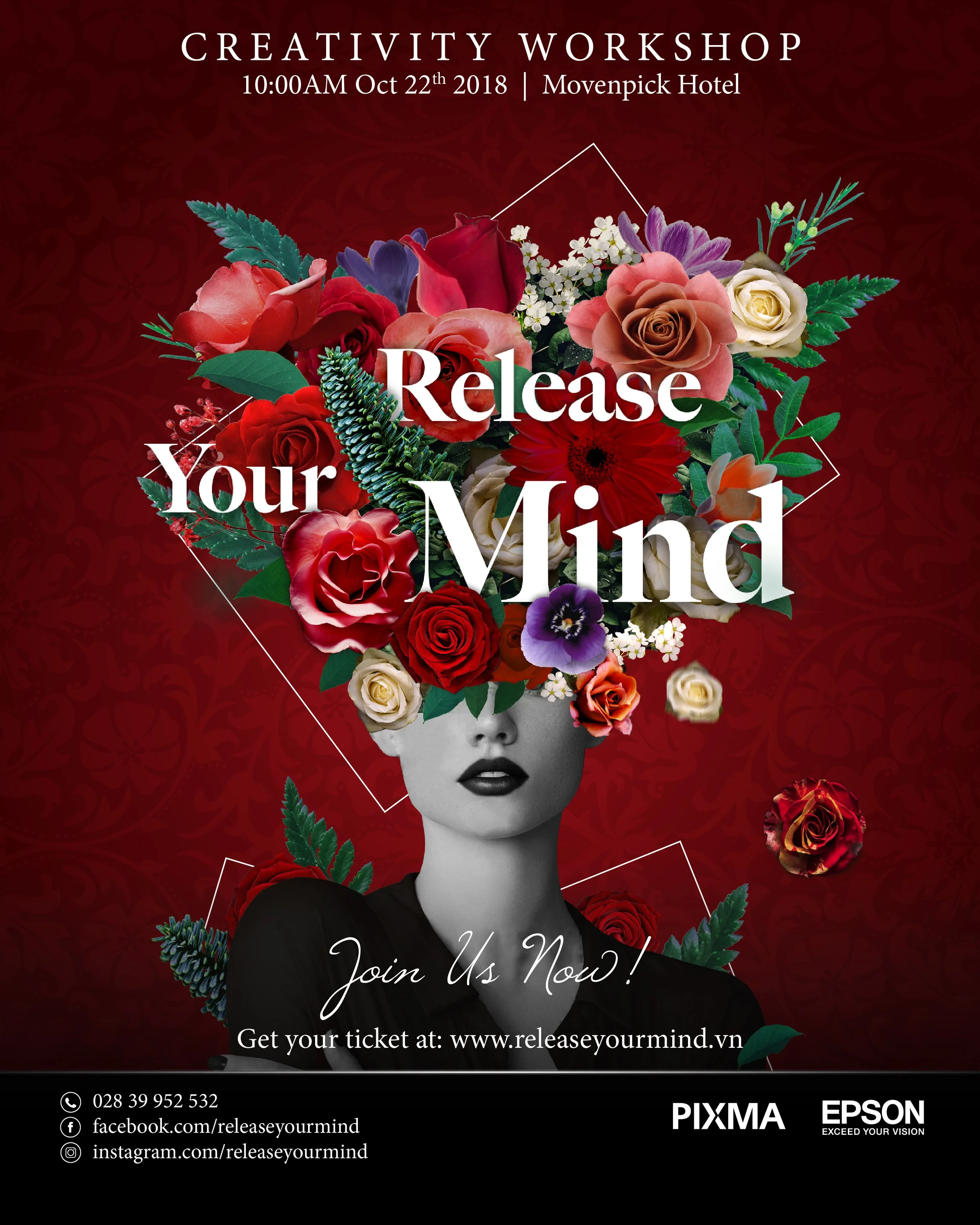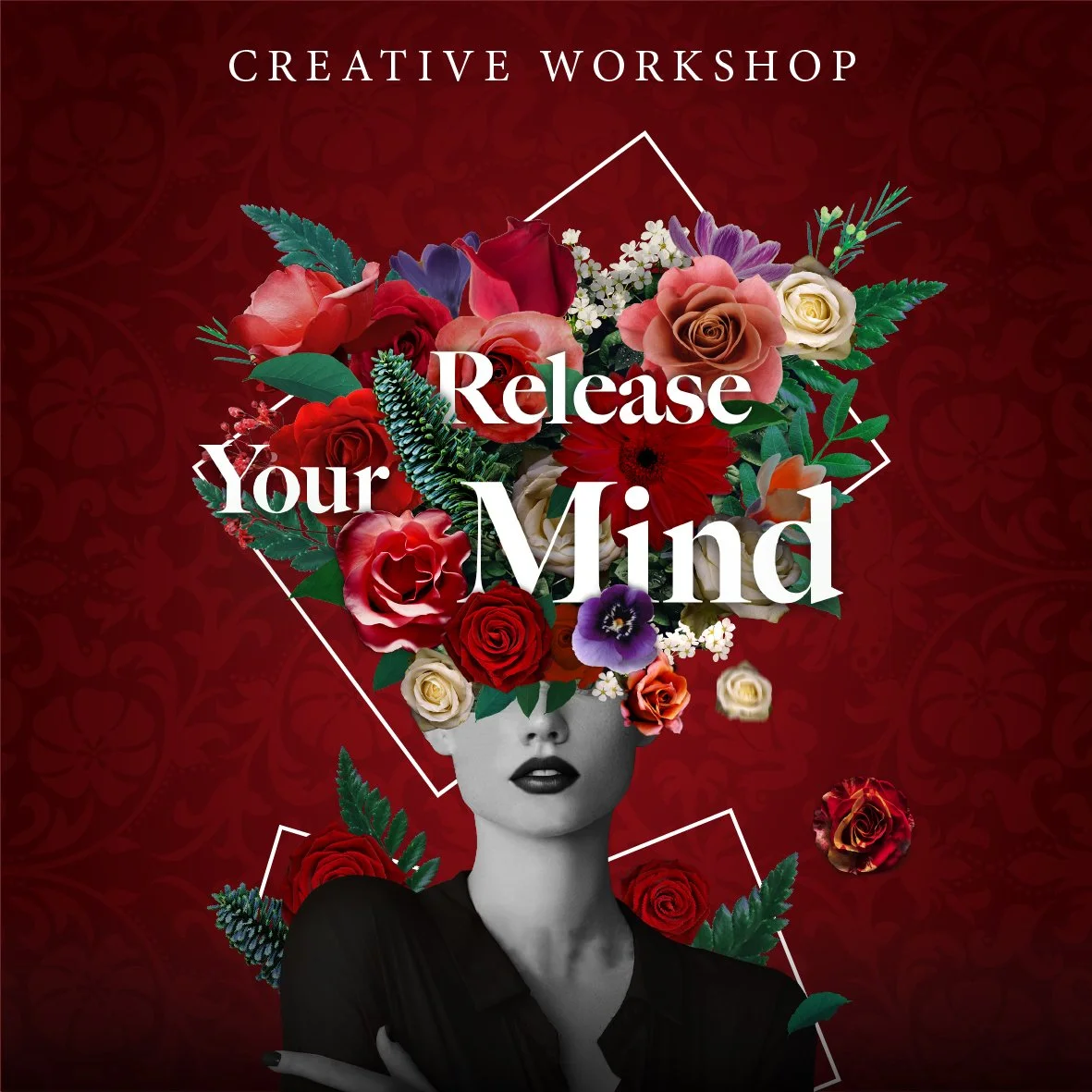 The final concept captures the essence of “Release Your Mind” by translating the workshop’s core idea into a surreal composition. The black-and-white portrait represents structure and constraints that many aspiring creatives experience, while the explosion of vibrant floral elements emerging from the head symbolizes imagination, growth, and potential of creative thinking. By covering the eyes, the design shifts focus away from literal vision toward internal perception, reinforcing the idea that creativity comes from within. The use of surrealism challenges the logic and invites viewers to experiment and explore further. And the use of red as the dominant color emphasizes passion, intensity, and creative energy. Together, the concept aims to maximize attention and curiosity with visually striking imagery.