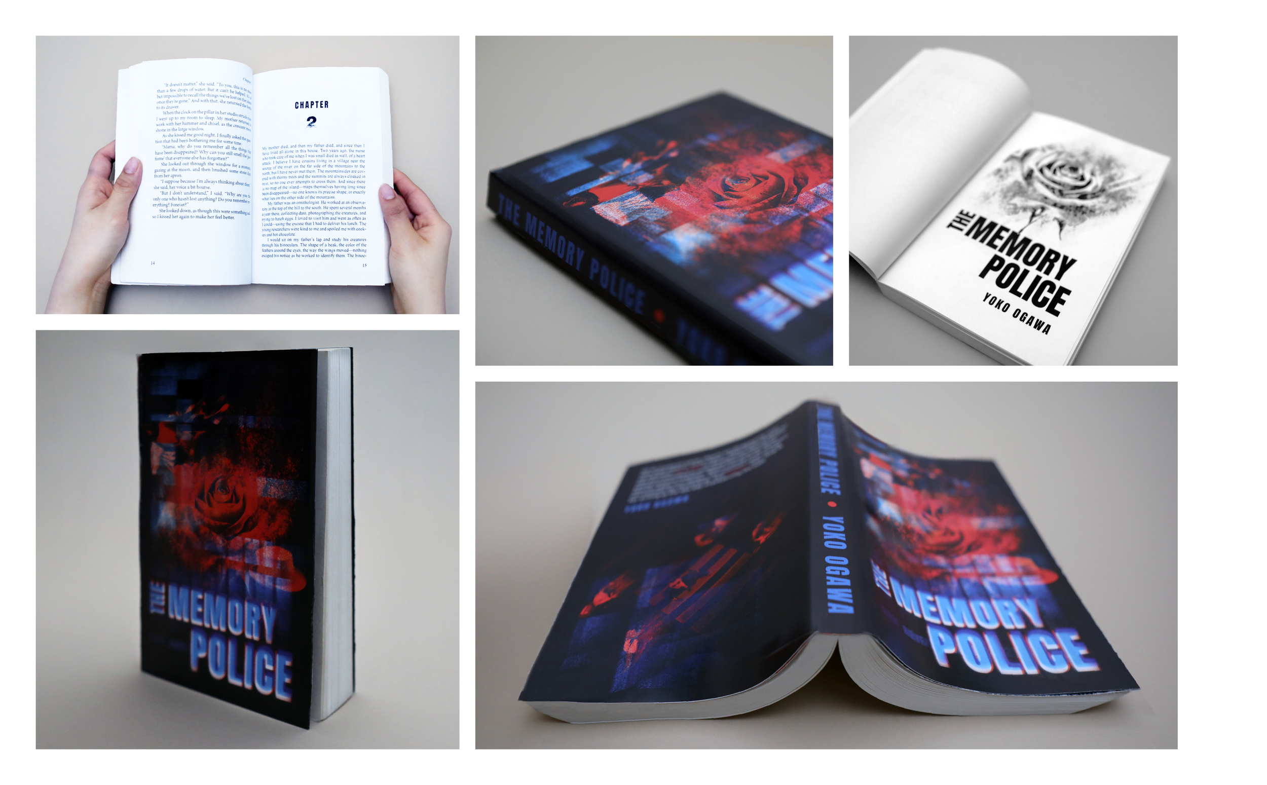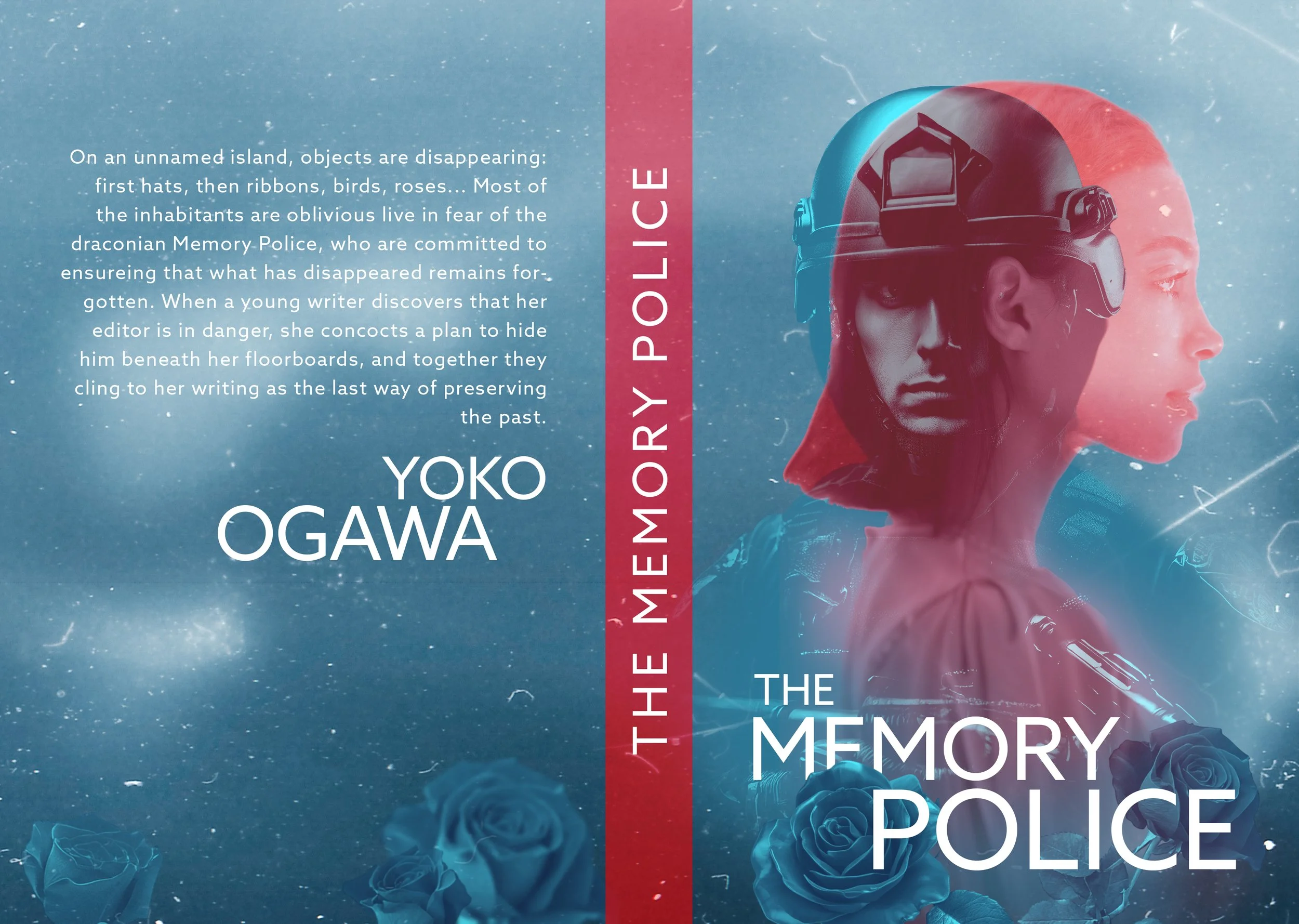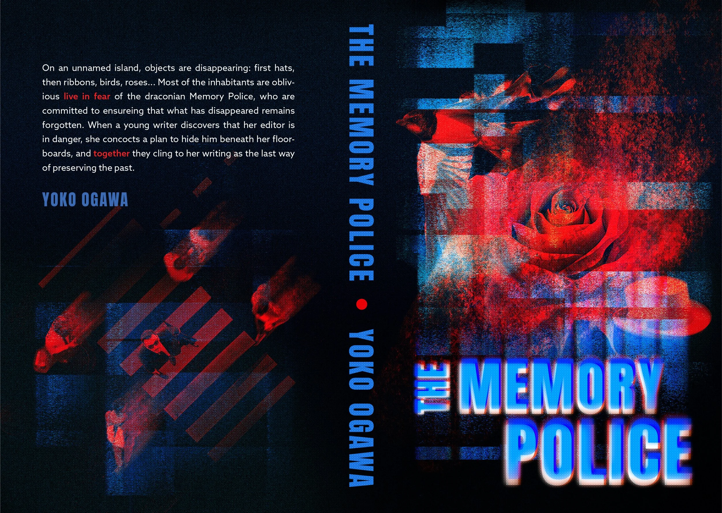 The second solution is image-dominant composition. The inclusion of key objects in the book such as roses and birds from the book represents disappearance as they dissolve into dust along with glitch textures and visual noise. The layer of abstract blue shapes in the front cover evokes police siren lights, reinforcing authority without directly depicting the Memory Police. The top-down perspective in the back cover suggests surveillance and the unsettling idea that people are being watched by unseen force they cannot understand.