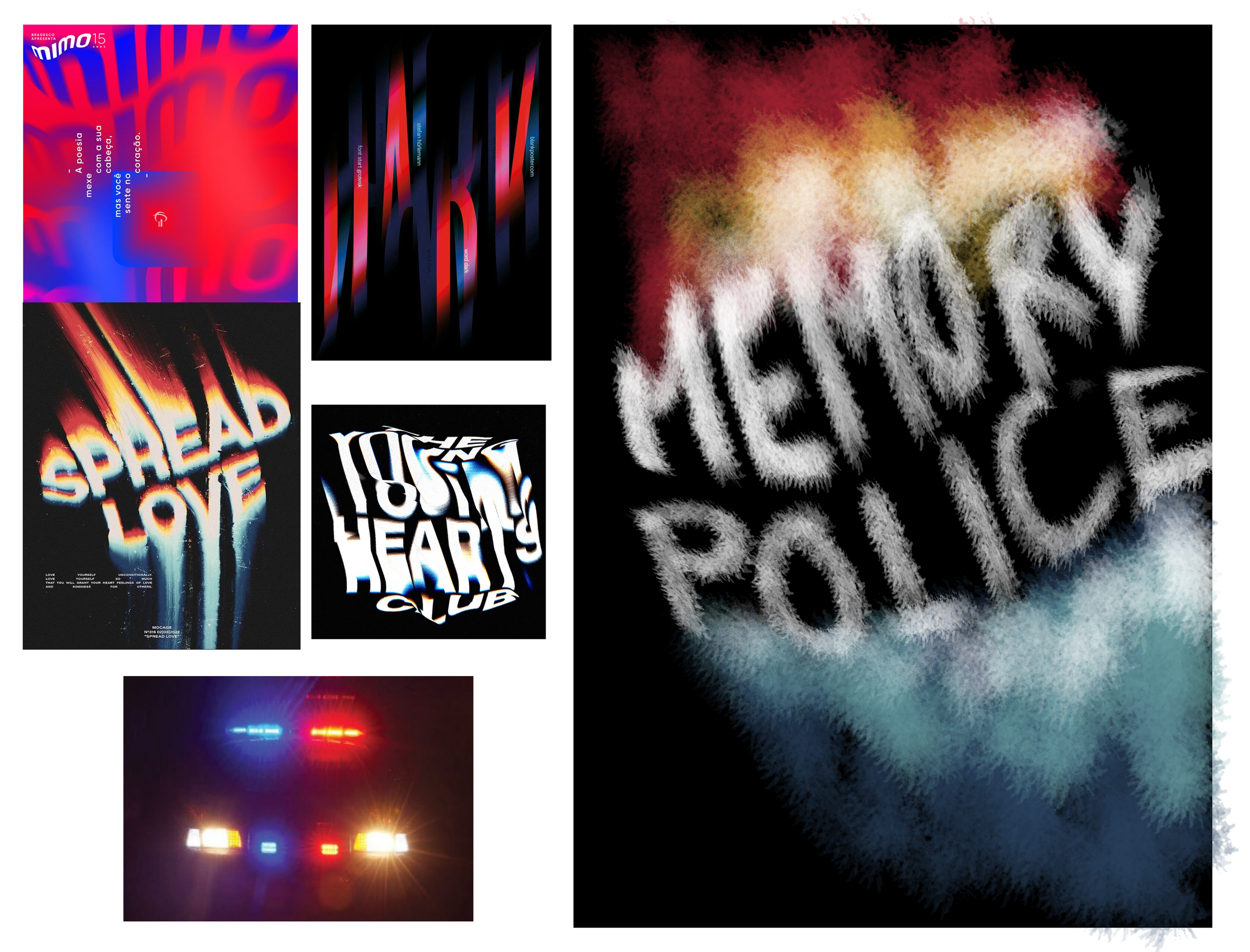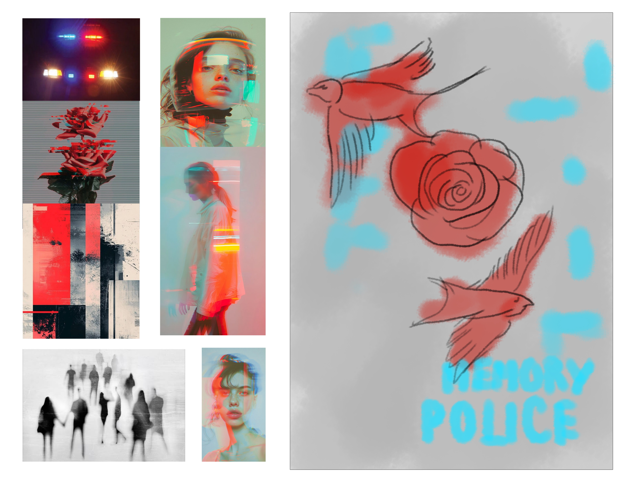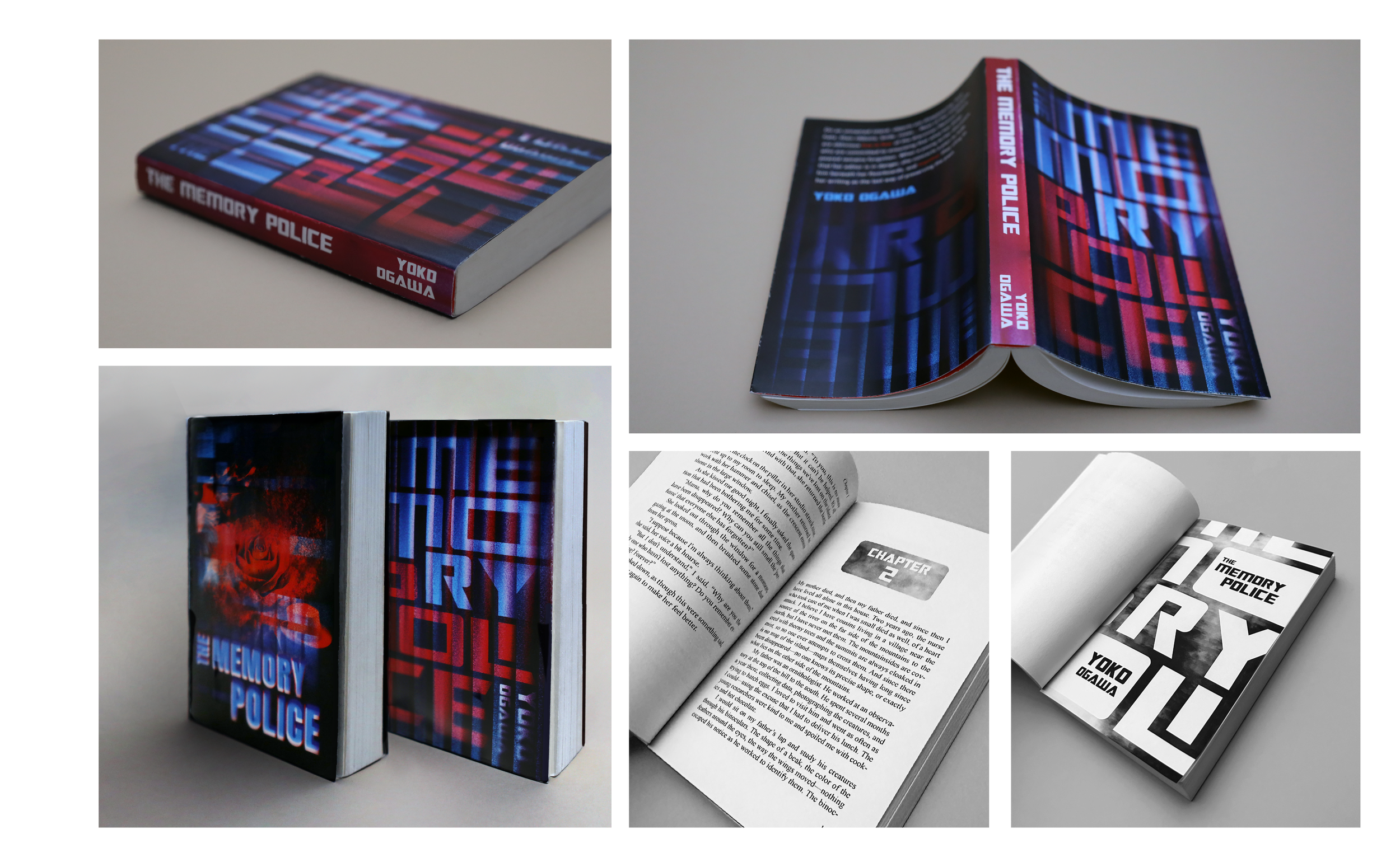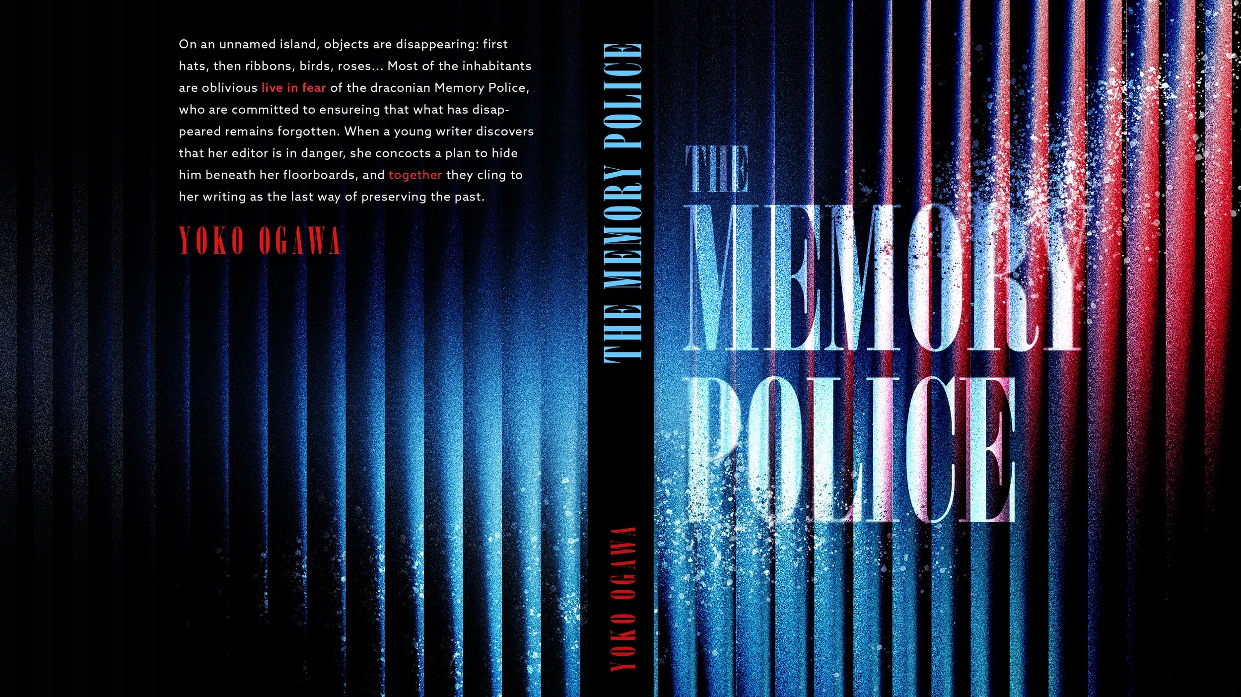 The second solution is image-dominant composition. The inclusion of key objects in the book such as roses and birds from the book represents disappearance as they dissolve into dust along with glitch textures and visual noise. The layer of abstract blue shapes in the front cover evokes police siren lights, reinforcing authority without directly depicting the Memory Police. The top-down perspective in the back cover suggests surveillance and the unsettling idea that people are being watched by unseen force they cannot understand.