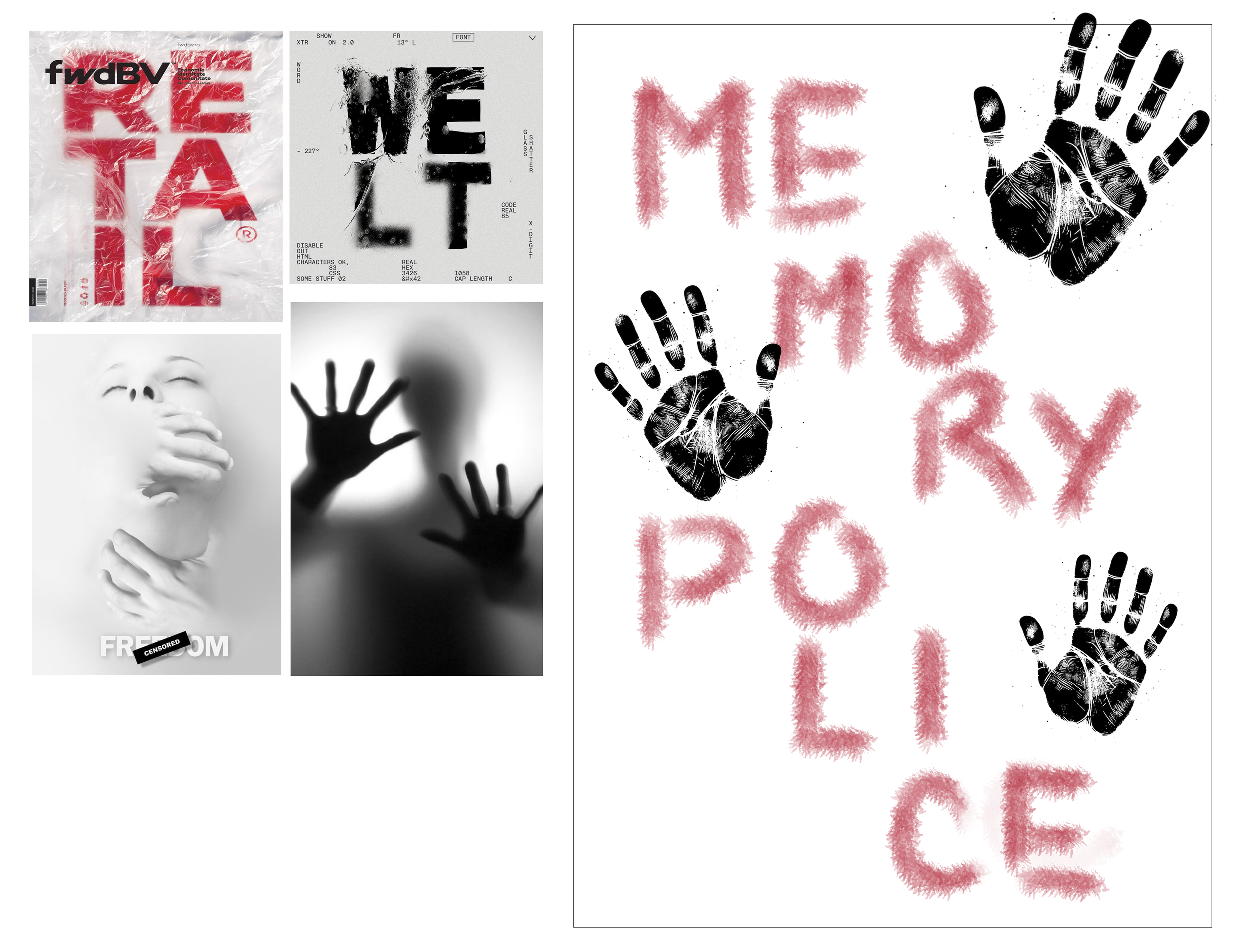 The first solution is type-dominant composition. It transforms typography into the concept itself. By manipulating the letterforms into a geometric layout, the composition builds a visual “maze” that feels repetitive and inescapable—echoing how the inhabitants are trapped within an invisible system enforced by the Memory Police. The use of glassmorphism effects with transparent, blurred layers and refracted edges creates a sense of distortion and illusion. Additionally, the integration of type across front, spine, and back establishes continuity, suggesting the book's theme is about controlled systems